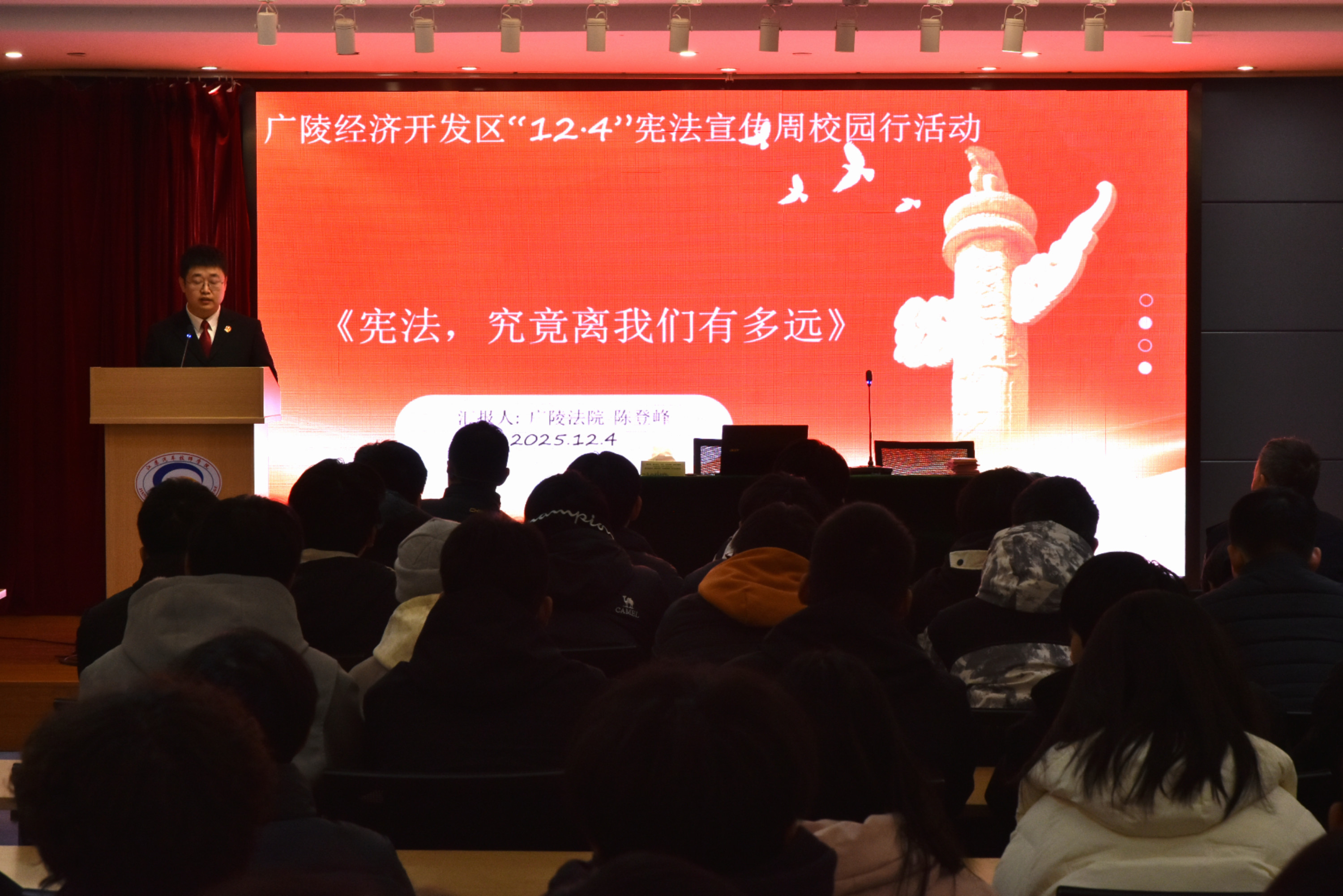 首先,广陵区法院陈法官以《宪法,究竟离我们有多远》为主题,结合生动案例与社会热点,深入浅出地阐释了宪法与国家发展、社会运行及个人生活的密切关联,引导师生深刻认识宪法的根本性地位与时代价值,让法治信仰悄然扎根。