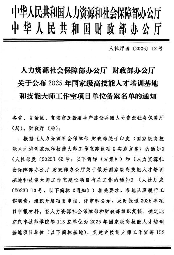近日,人力资源社会保障部办公厅、财政部办公厅联合发布《关于公布2025年国家级高技能人才培训基地和技能大师工作室项目单位备案名单的通知》,学院成功入选2025年国家级高技能人才培训基地项目单位,充分彰显了学院办学实力与服务能力的国家层面高度认可。
