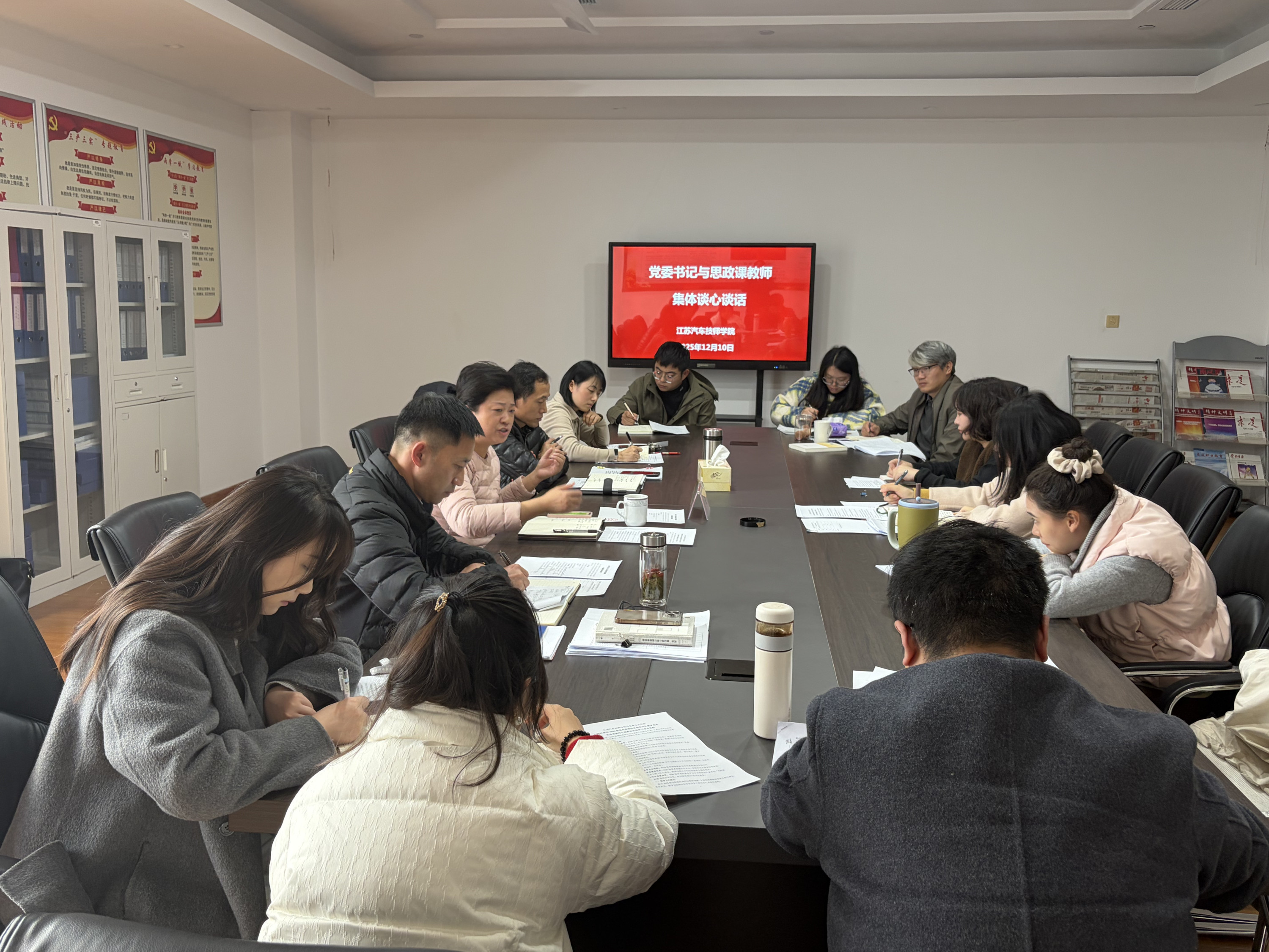 在党委书记与思政课教师集体谈心谈话环节中,书记提出六点要求:一是明确课程定位,紧扣职业特色;二是优化教学设计,回应时代课题;三是开发校本资源,讲好身边故事;四是创新教学方法,增强互动体验;五是创设情境教学,用数字化赋能课堂;六是加强师资建设,做好自身提升。