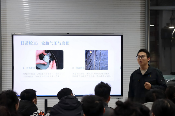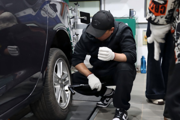 季伟剑老师结合自身多次参与国家级、省级技能竞赛的实战经验,系统讲解行驶中爆胎的正确应对步骤、安全停车规范、工具使用方法以及备胎更换全流程。学员们按照“开启双闪、设置警示牌、松螺栓、支千斤顶、卸轮胎、装备胎”的操作流程,逐一上手操作,沉浸式掌握应急技能。一位刚完成备胎更换的学员感慨道:“以前遇到爆胎只会打救援电话,自己完全不敢动。今天亲手换了一次,才发现只要方法对,并不难”。现场学员普遍表示课程“实用、硬核、关键时刻能救命”。季伟剑老师在课后表示:“掌握基本的车辆应急技能,不仅能在路上自救,也能帮助他人。希望依托学院的专业平台,让更多人具备这份‘出行安全感’。”